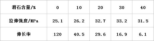 這主要是因為,隨著滑石粉的加入,滑石粉填充到高分子物間隙中,防礙了高聚物分子間的作用力,從而導(dǎo)致填充材料拉伸強度下降。但若滑石粉經(jīng)過表面處理且混合均勻,則對改性料拉伸強度的影響會 小一些,同時提高滑石粉的細度也有利于提高改 性料的拉伸強度。